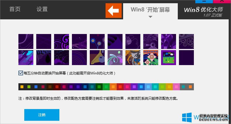 2、看到都是开始屏幕的主题,勾选之后每5分钟自动更新一次,当然前提是要开始Win8优化大师哟。