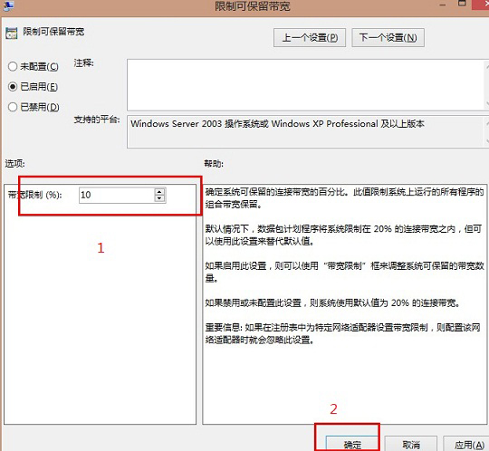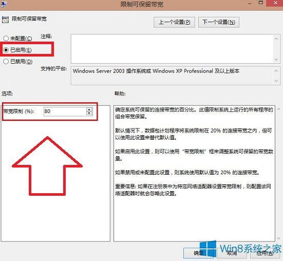3、在帮助的说明栏里发现“如果禁用或未配置此设置,则系统使用默认值为20% 的连接带宽。”这么一句话,换个意思就是它会限制你80%的网络带宽!会影响下载速度!因此我们这里调整一下,如下图: