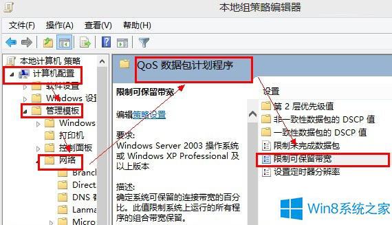 2、在右侧的选项栏依次打开 计算机配置-管理模块-网络-QoS数据包计划程序,双击打开限制可保留带宽,如下图: